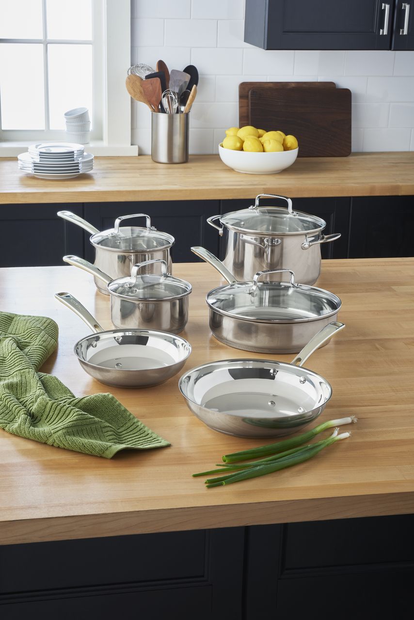 Experimente el calentamiento uniforme de una capa de aluminio entre dos capas de acero inoxidable. Este conjunto de acero inoxidable de tres capas incluye: sartén de 8 ", sartén de 10", cacerola de 1.5 cuartos con tapa, cacerola de 3.0 cuartos de galón con tapa, salchicha de 3.5 cuartos de galón con tapa, olla de 8.0 cuartos con tapa